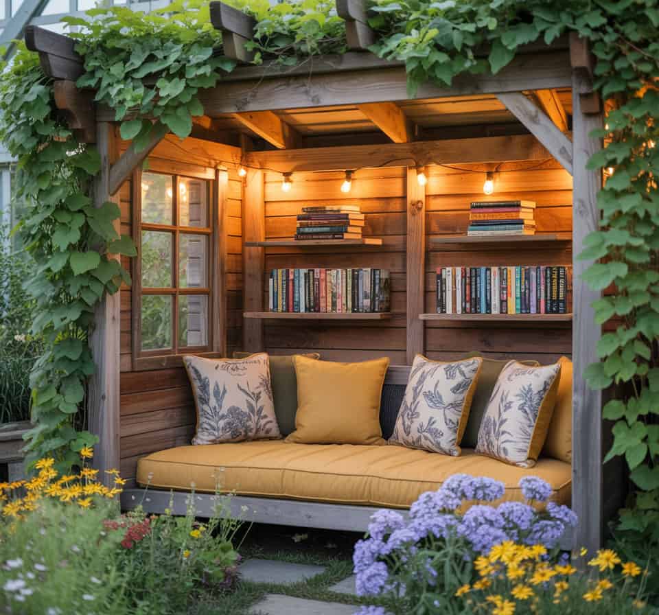 Not every reading nook needs to be elaborate. A small shelter built from pallets with a slatted back wall and string lights can feel just as inviting. I often remind myself that scale matters less than intention.