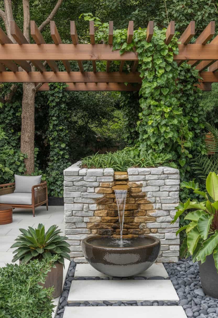 This design shows how wall fountains can serve more than one purpose. The water feature doubles as a visual screen, adding sound and movement while reinforcing privacy.