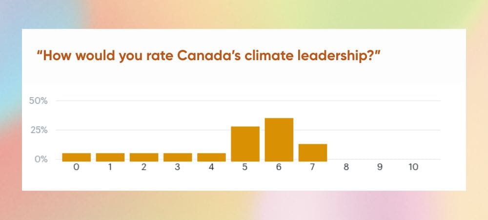These sustainability torchbearers say that Canada is seriously dropping the ball on climate. When asked how they would rate Canada’s climate leadership out of 10, more than half picked 5 or 6. The average rating was 4.6.