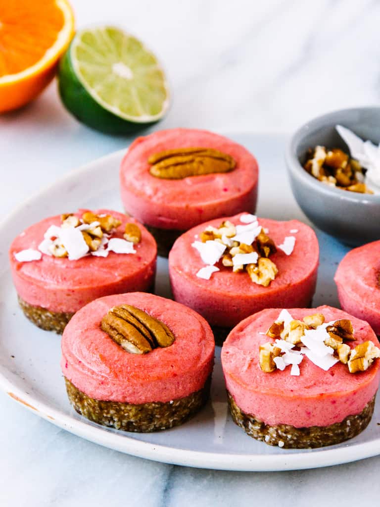 How could we leave out strawberry cheesecake in a list of raw vegan dessert recipes? This much healthier version packs a serious explosion of flavours, and tastes fresh and light. Just six ingredients, too!