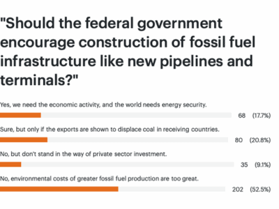 In response to a question that garnered 385 responses, 52.5% said Ottawa should not offer incentives for new oil and gas pipelines or terminals because the environmental costs are too high. Only 17.7% offered unqualified support for such incentives, while 20.8% said yes if the Canadian resources would displace the use of coal overseas.